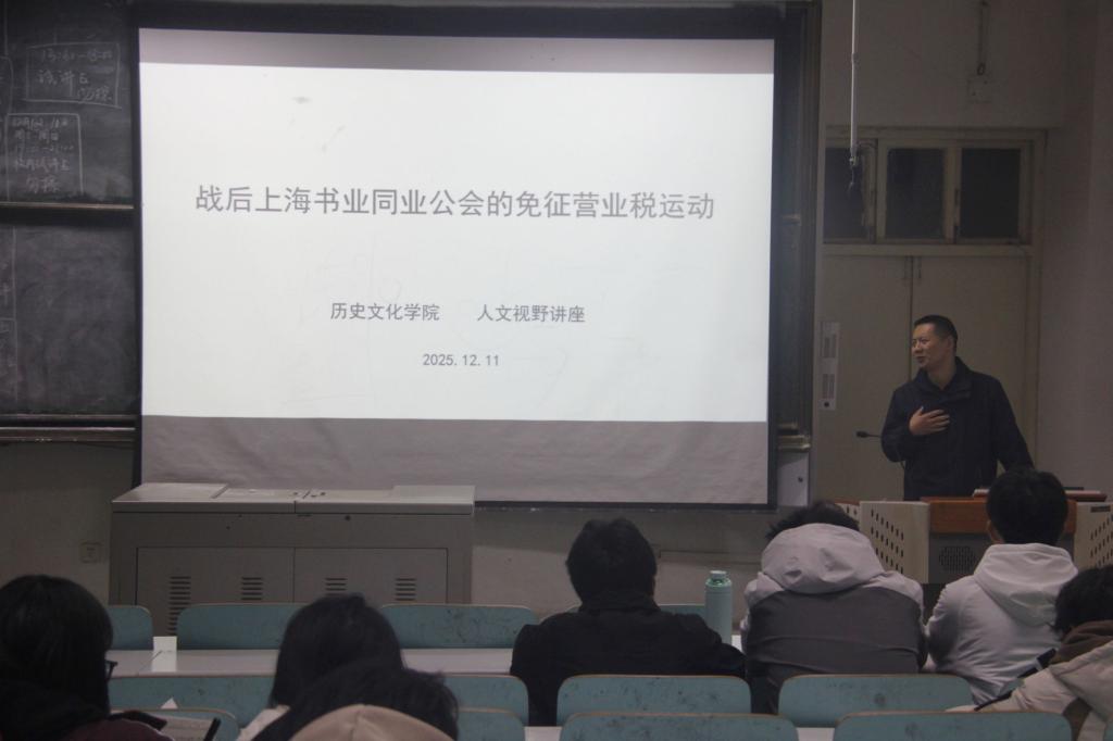 12月11日晚,李晓波博士在人文楼609为皇冠集团网站学生开展题为“战后上海书业同业公会的免征营业税运动”的学术讲座,皇冠集团网站2025级学生到场听讲。