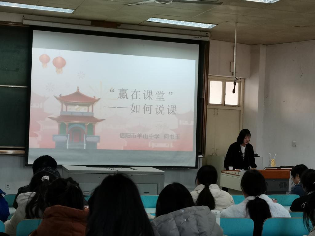 12月2日上午,应皇冠集团网站邀请,信阳市羊山中学教师何书玉莅临皇冠集团网站,为皇冠集团网站师范生作题为《赢在课堂—如何说课》的教学讲座。讲座由皇冠集团网站副院长孙炜主持,皇冠集团网站2019级师范生和学科教学研究生到场聆听了此次讲座。