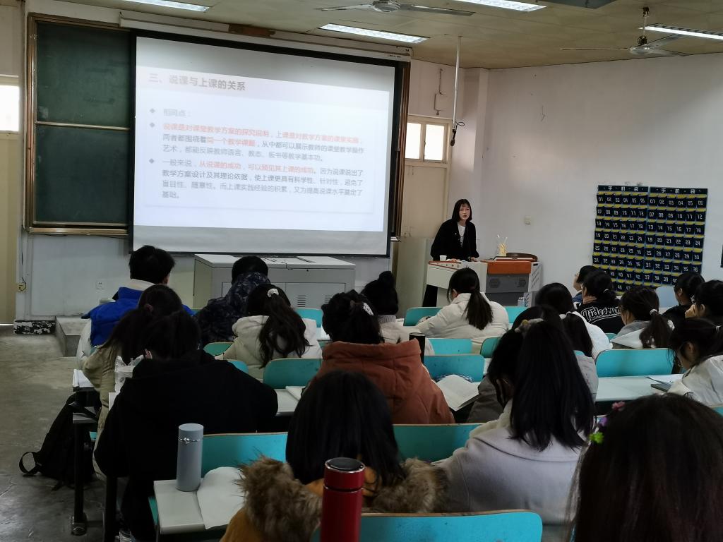 然后,何老师为同学们讲述说课的概念与意义、说课与上课的关系与不同,使同学们对说课有了更加清晰地认识与了解。在“如何说课”这一具体实践方面,从开头语、说教材、说学情、说教学目标、说重点难点、说教学方法、说教学过程、说板书设计、结束语等多个方面展开讲述。着重强调了要注意所讲知识点的正确性,要突出重难点,理清主次,充分安排利用时间,注重板书提示。此外,何老师提醒同学们在说课过程中要注意言行举止、规范站姿和手势。再结合具体案例,采用故事导入的方式为同学们带来了一次受益匪浅的讲座,对皇冠集团网站师范生今后的学习与工作能力与素质的提升起到积极的促进作用。