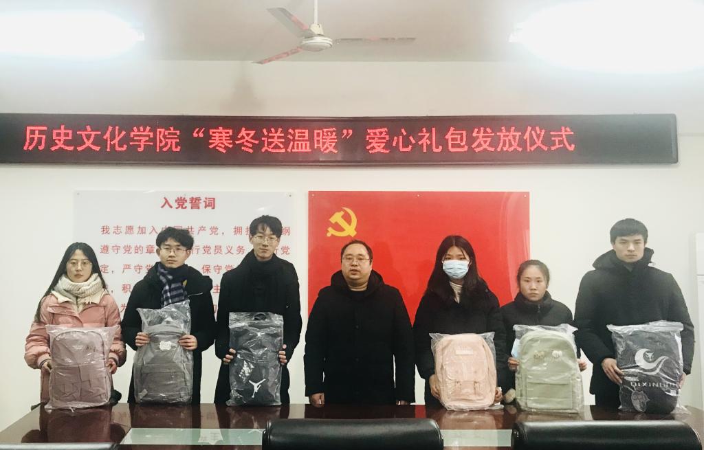 爱心礼包包含一个书包、围巾、手套、热水袋等保暖用品,帮助同学们暖暖和和度过寒冬。仪式上,刘喜元表达了对同学们殷切的关心,叮嘱大家注意身体健康,做好防护。同时也希望同学们要常怀感恩之心,努力发奋学习,不负学校和家长期望,争做对社会有用的优秀大学生。