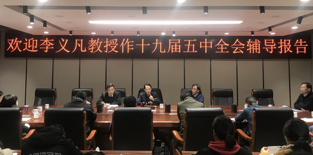 李义凡以《学习十九届五中全会精神的几点体会》为题,从内容与精神、亮点与特色和理解与启示等三个方面对十九届五中全会通过的《中共中央关于制定国民经济和社会发展第十四个五年规划和二〇三五年远景目标的建议》(简称“建议”)进行了详细解读。李义凡认为:《建议》是党内外各界人士集思广益的智慧成果,体现了其民主性;新发展理念贯穿建议稿始终,体现了其创新性;从国家发展的各个方面制定规划,体现了其系统性;兼顾近期规划和远景目标,体现了其务实性。他指出,《建议》给个人与单位的启示主要有三个方面:谋划工作及人生规划要着眼长远和大局、要善于辩证的认识问题、要善于抓主要矛盾。