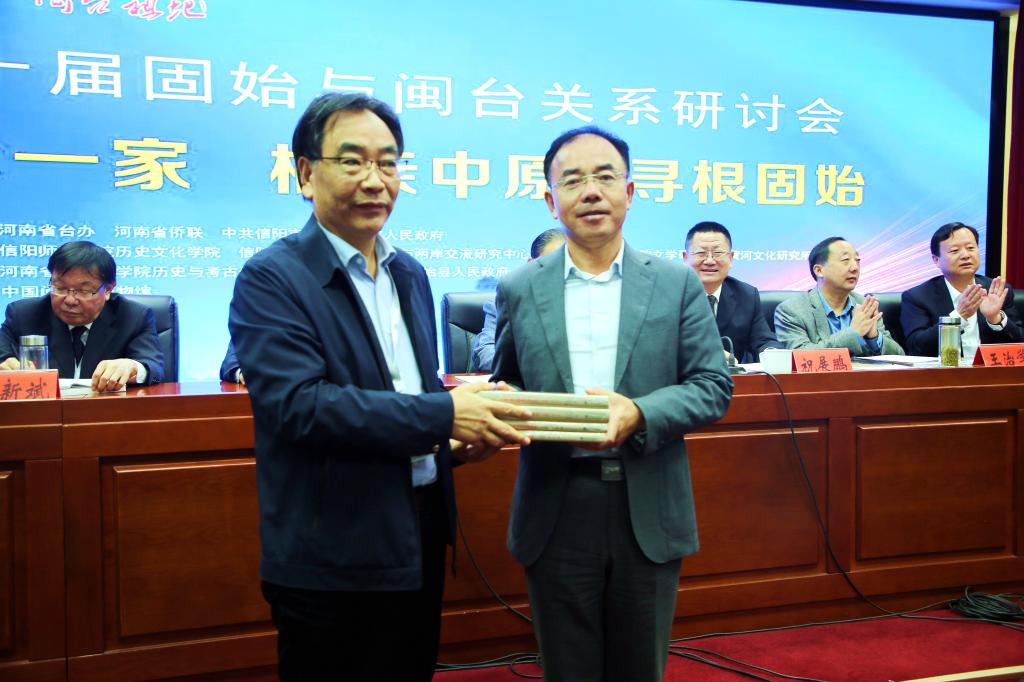 尹全海教授代表根亲文化与两岸交流研究团队,向固始县委县政府赠送图书,并主持大会研讨。皇冠集团网站副院长李志坚宣读会议纪要。