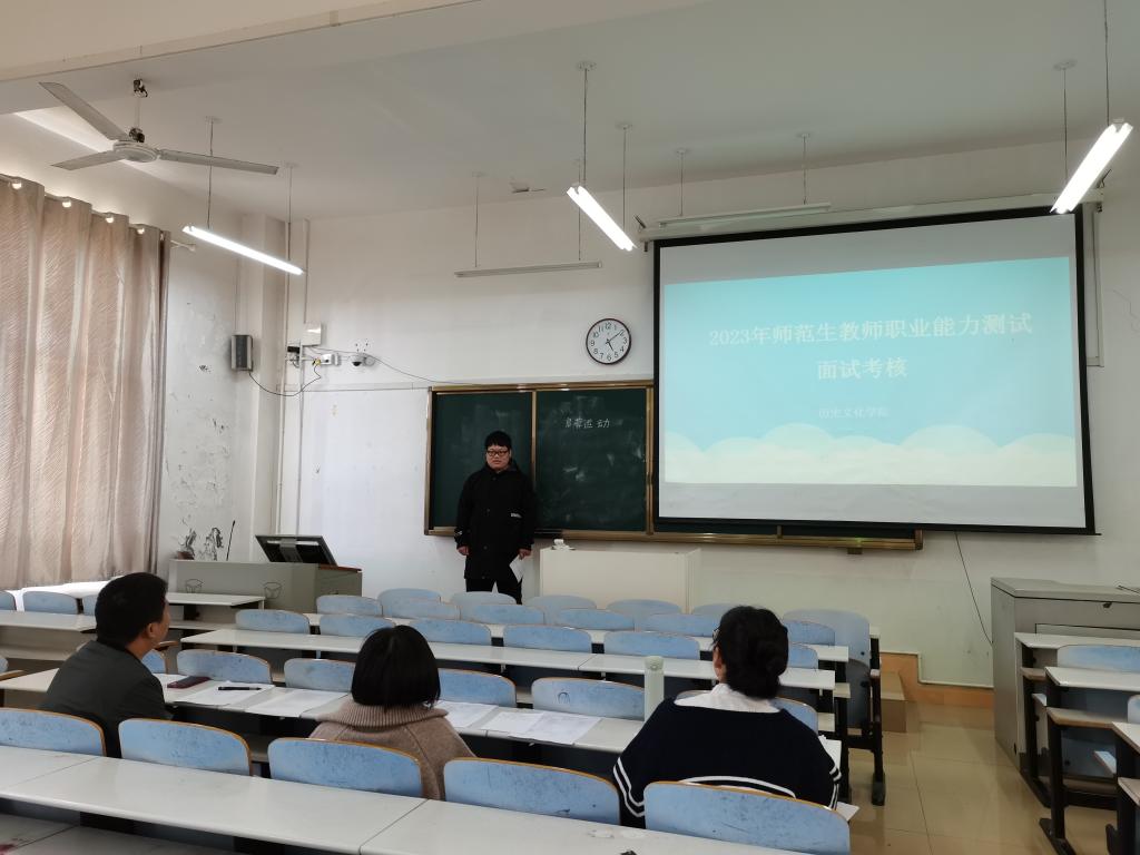 本次面试考核共设立了1个候考室、3个备考室和3个面试考场。面试评委由高校教师、中学教师组成。考生现场抽取试题,依据面试流程依次入场,每位同学有20分钟的时间接受测试。面试考核,主要有结构化情景提问、试讲、答辩等环节,全面考查师范生的教育管理、人际关系处理、时事政治理论等能力,专业基本知识、语言表达、教态仪表等教学基本素养和历史教学设计、课程讲授等教学技能。